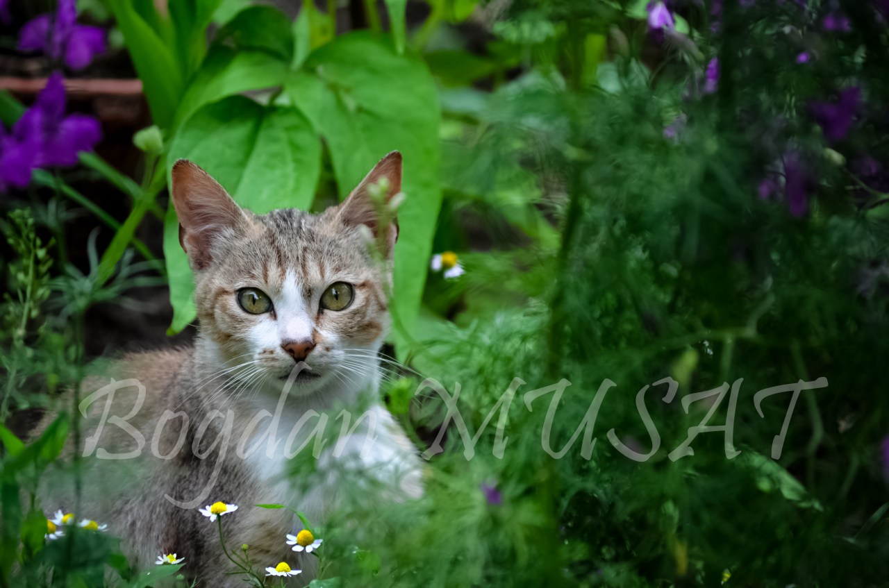 Ma gandeam sa postez ceva despre pisici. Consilierul meu, fiica mea adica, mi-a zis ca are asaa…un mood floral, ceva flower-power. Hmmm. Si iaca-asa am ajuns la aceasta fotografie: pisica intre flori.