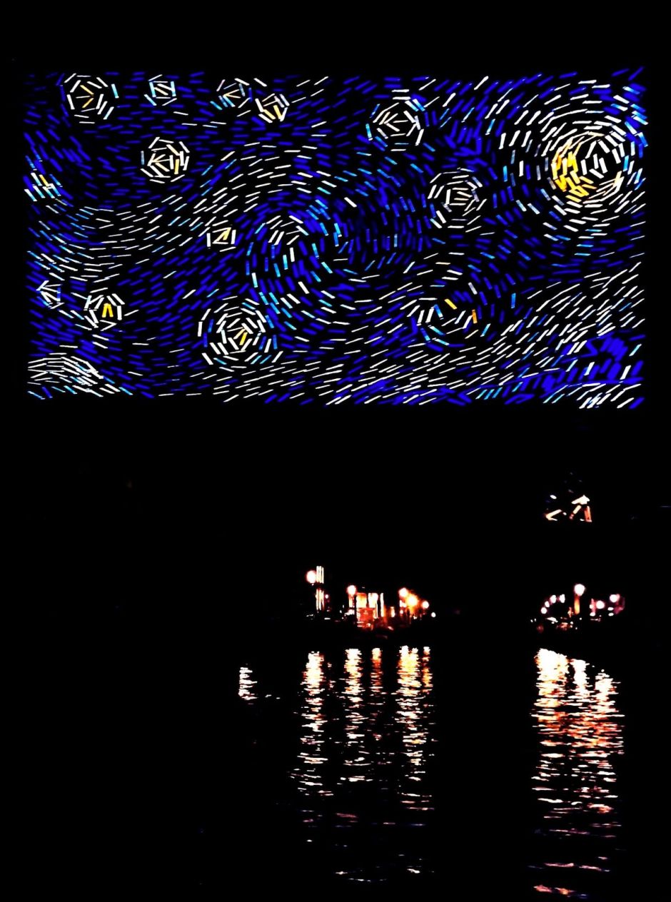 În imaginea de azi este o instalație expusă în Amsterdam în cadrul Festivalului Luminii 2018, după lucrarea lui Van Gogh, Noapte înstelată, devenită o imagine fundamentală a expresionismului, lucrare despre care puteți afla mai multe aici.